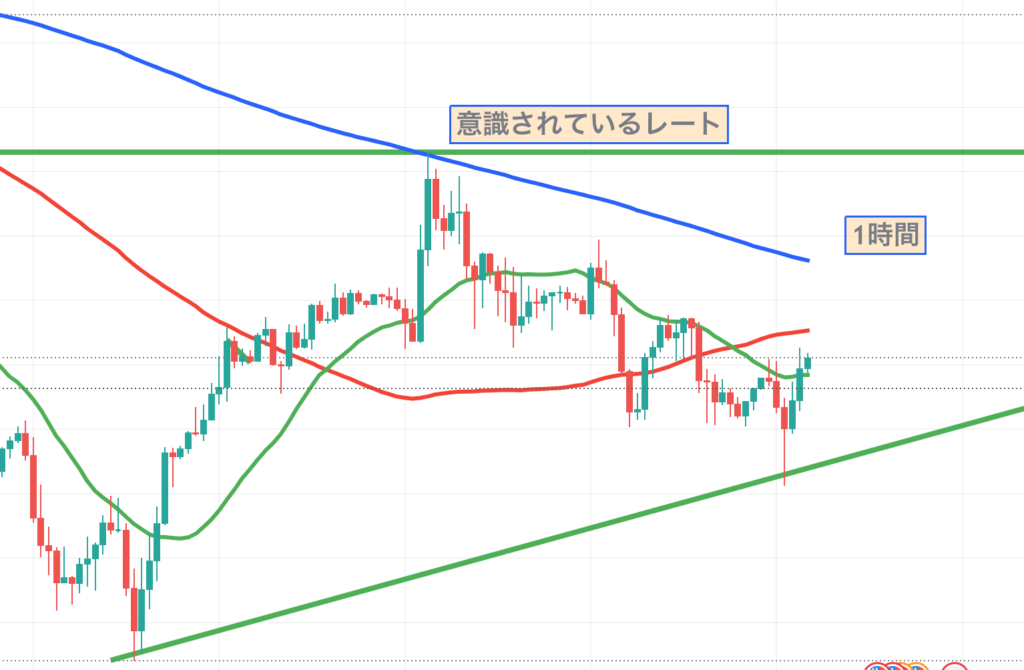 1時間足で確認すると、安値が更新されてきていますが、大きくヒゲが伸びて、移動平均線を超えてきています。安値が切り上がっているのを確認して、売りの勢力がなくなってきていますね。