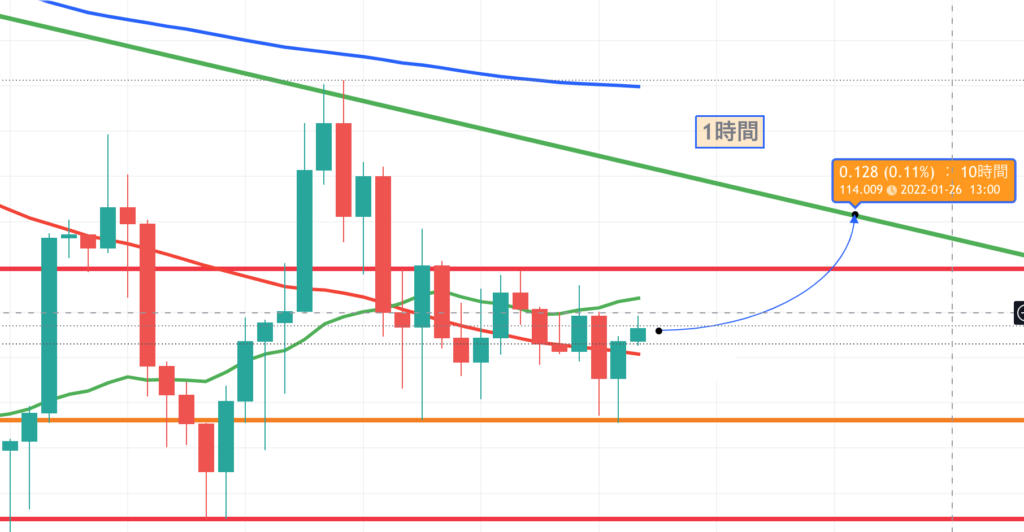 1時間足で見ていますが、かなり動きが小さくなって来ていますね。この赤線サイン超えたら、買いエントリーですね。逆にオレンジラインを超えたら売りで、エントリーですが、こちらは、113.65あたりで利確していないとダメですね。
