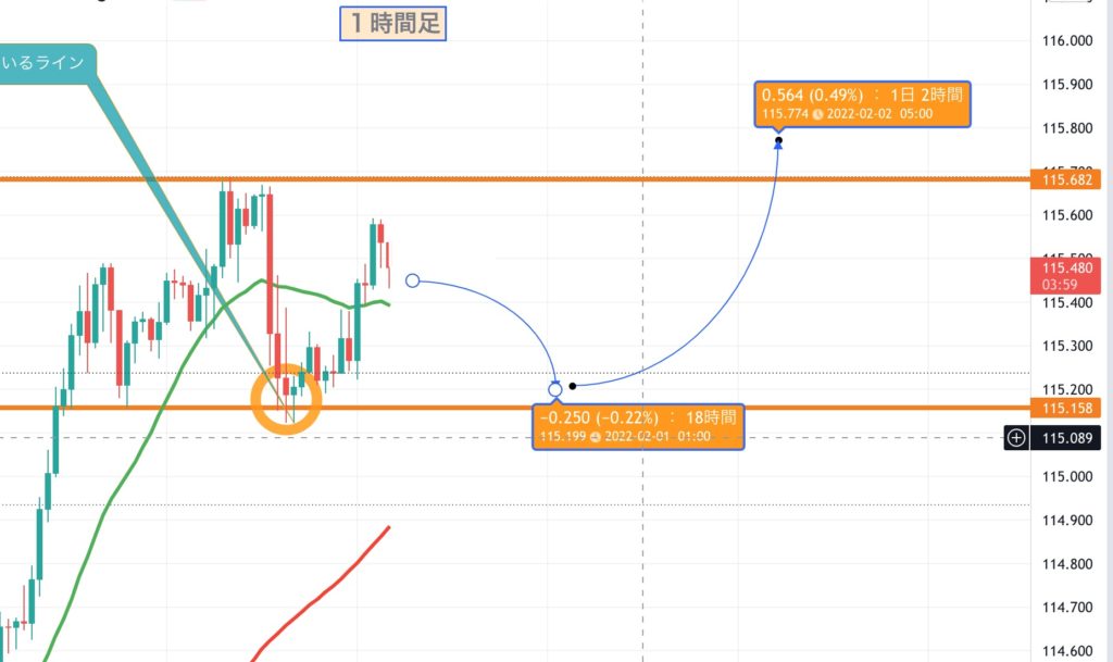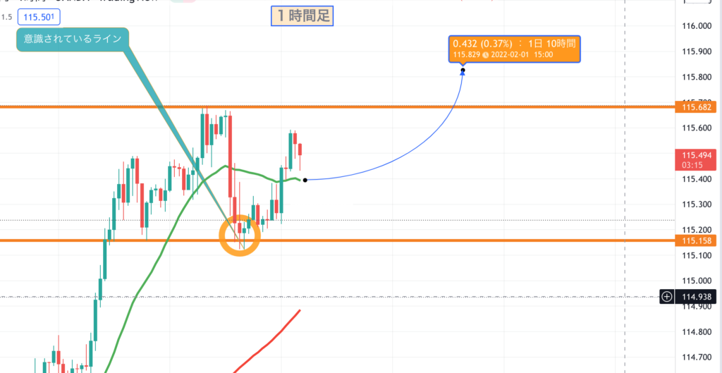 1時間足で確認してみると、115.15辺りが反発されているので、この辺りがかなり意識されているのが分かります。