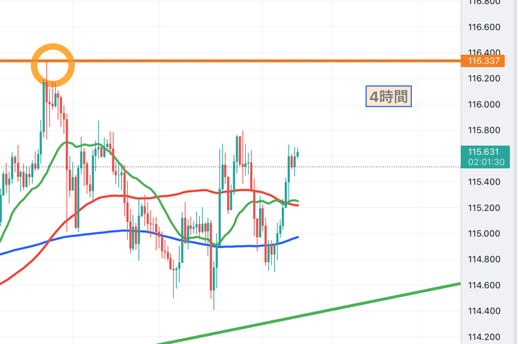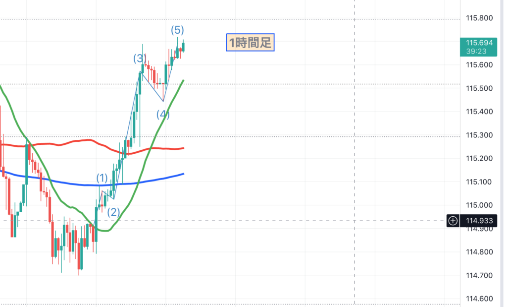 115.30あたりを超えてから、4時間の資金も入ってきた感じですね。