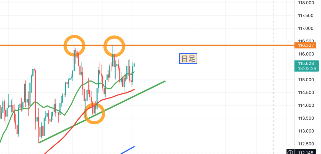 115.44あたりに損切りを移動させているので、ここ超えたら、売りを検討ですが、まだ、長期では、上昇トレンド中なので、利食いは早めの戦略ですね。