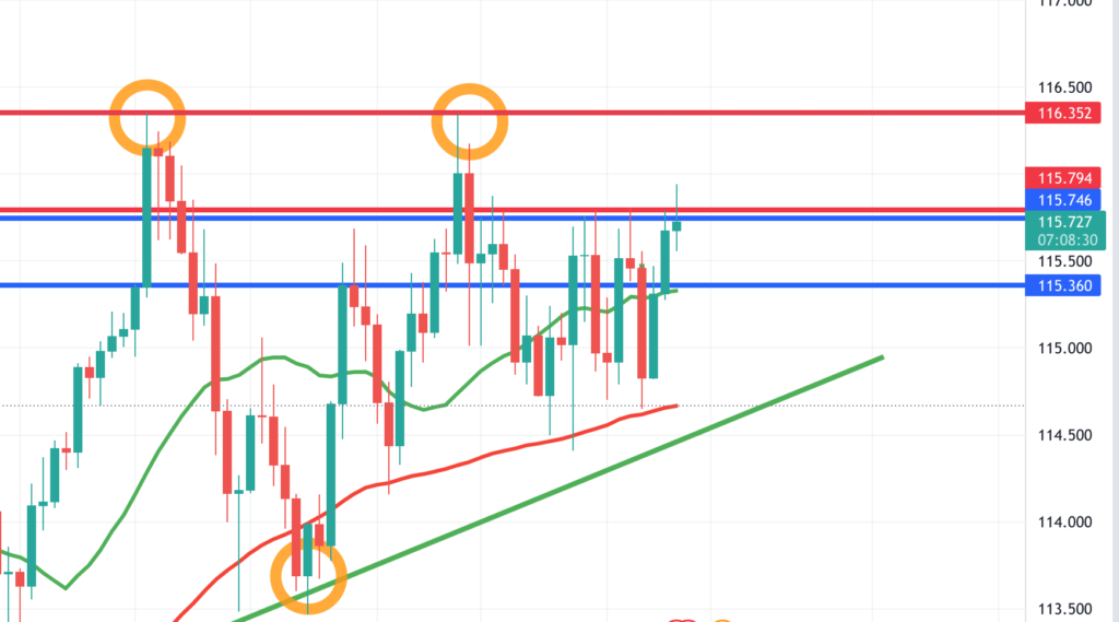 115.55ぐらいまで調整して、またヒゲが伸びています。損切りが浅目だったのもありましたが、寝てる間に、撃沈されてしまいました。(😂😂😂)