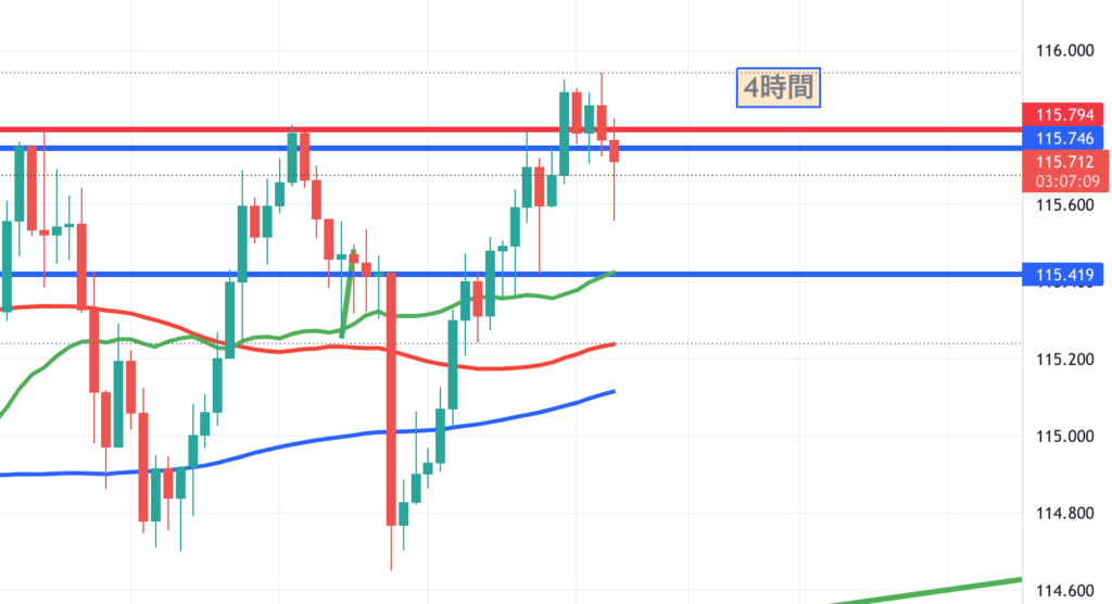実は、今回、115.80あたりでエントリーして、損切りにかかりました。(115.70)