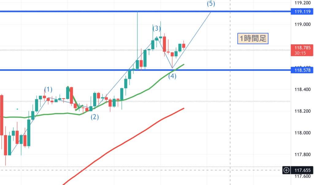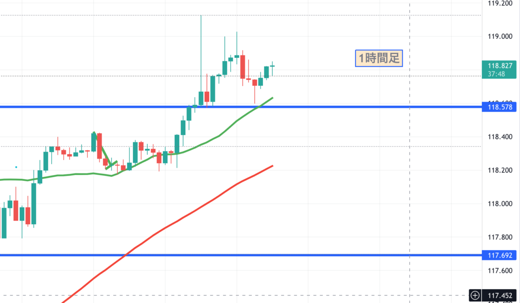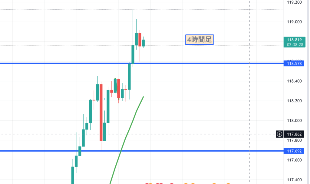 日足で見ていくと、凄まじい勢いで上昇しています。116円台から119円台へ、わずか4日で到達。